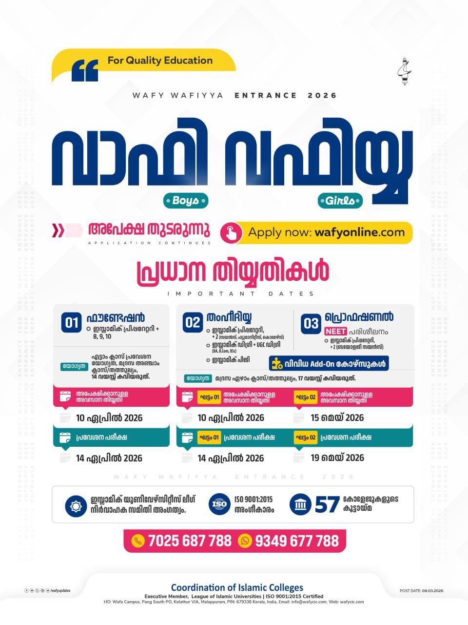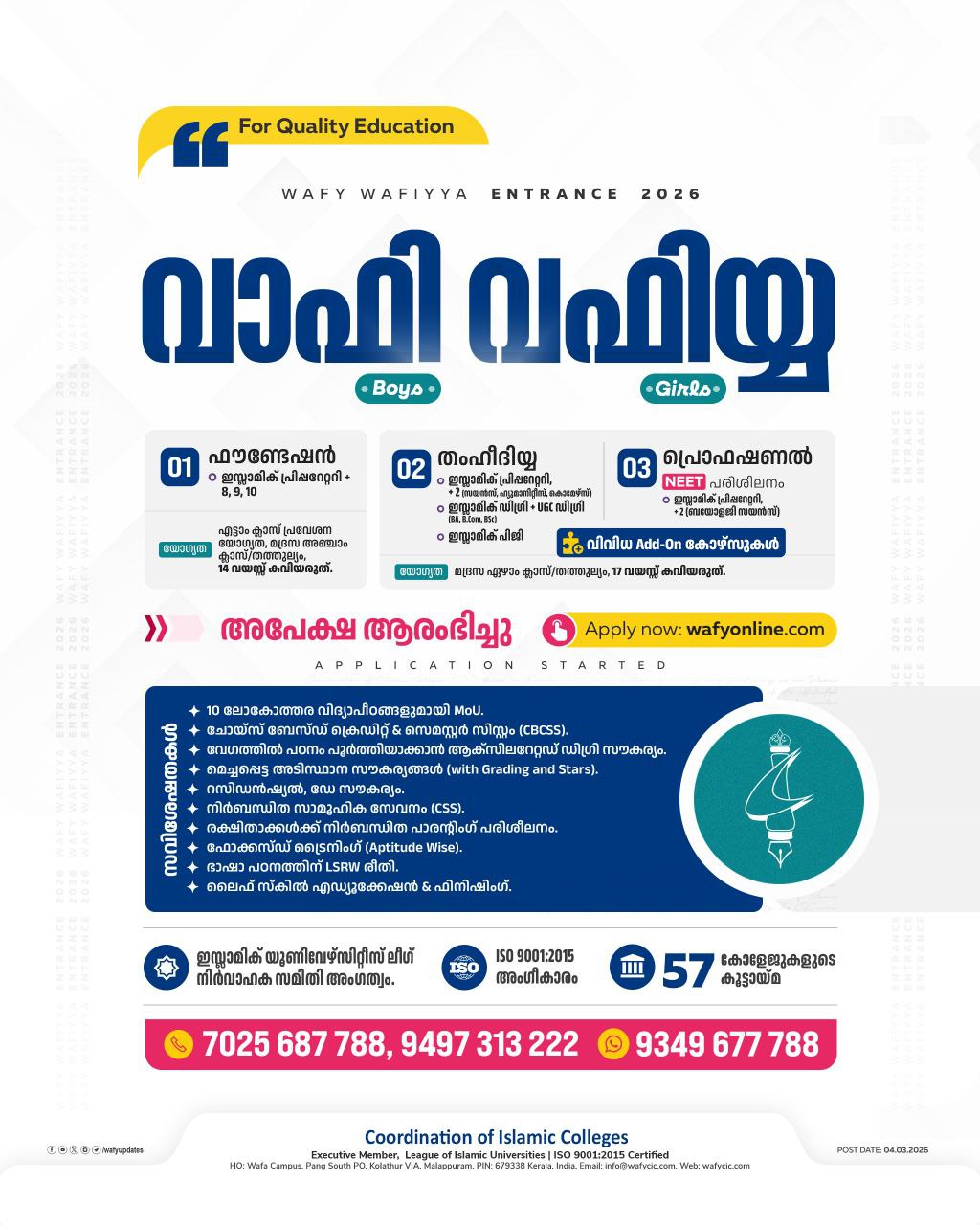 വാഫി വഫിയ്യ കോഴ്സുകൾക്ക് ഇന്ന് (മാർച്ച് 04) മുതൽ അപേക്ഷിക്കാം: ▶️ wafyonline.com മുഖേന ഓൺലൈനായാണ് അപേക്ഷിക്കേണ്ടത്. ▶️ SSLC തുടർപഠന യോഗ്യതയും മദ്രസ ഏഴാം തരം/തത്തുല്യ യോഗ്യതയുമുള്ള പതിനേഴ് വയസ്സ്......